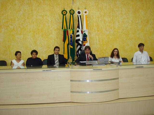 Mesa Diretora composta por: Maria Okamoto, Francisca Quentina de Brito, Divanir Ledo dos Santos, Vereador-Presidente Juliano B. Bertolini, Sra. Ana Carolina Cenedesi Machado Bertolini e Frei Flávio Antônio Gandili