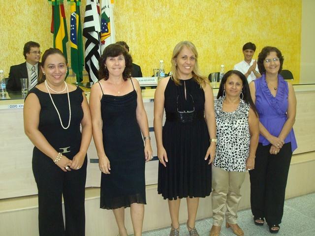 As funcionárias da Câmara sendo homenageadas pelo Presidente Juliano Brito Bertolini