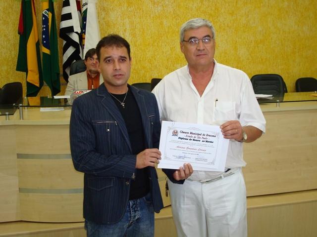 Vereador Francisco Rossi entregando o Diploma ao Sr. Adriano Gonçalves Lourenço, conhecido como Kuty.