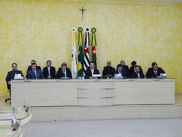 Mesa principal da sessão do 68º aniversário de emancipação de Dracena e entrega de Diplomas de Honra ao Mérito