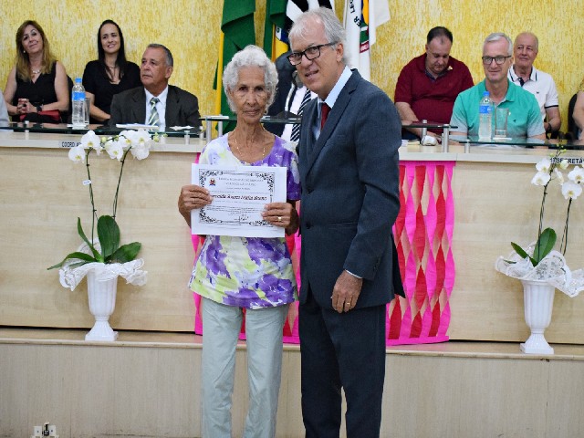 Homenageada Aparecida Soares Malta Boeno e o vereador Ailton Lorensetti