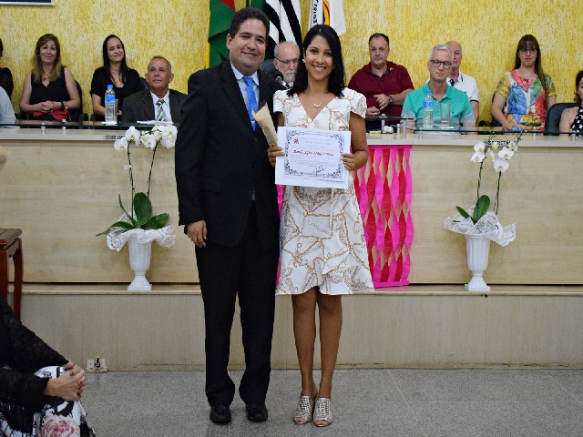 Vereador Rodrigo Castilho e homenageada Roseli Lopes Araújo Mena