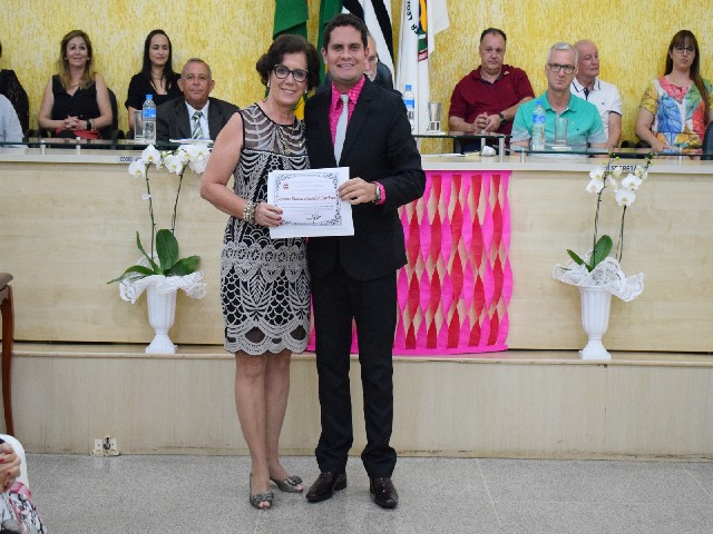 Homenageada Santina Fátima Cenerini Cardoso e vereador Victor Palhares