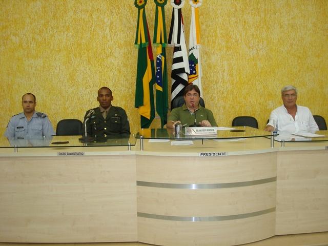 Mesa Principal - 1º Tenente Pedro Ângelo Miguez Caminha, Comandante do 2º Pelotão da 1ª Cia do 25º Batalhão da Polícia Militar, Sargento Douglas Emerson Dias dos Santos, Presidente, Vereador Juliano Brito Bertolini e Vereado