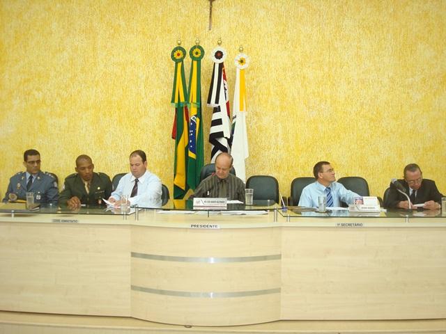 Mesa Principal composta pelo Presidente Nelson Nabor Buzinaro, Dr. Affonso Arthur Vieira de Resende; o Sargento do Tiro de Guerra Douglas Émerson Dias dos Santos e o Major Sílvio César de Almeida Saraiva