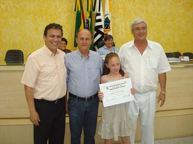 Dr. Marco Antonio Colman, Coordenador de Saúde Bucal, Dr. José Roberto Manzano Garcia Vereador Francisco Rossi e Débora Luana de Brito, aluna do 4º Ano da EMEFI João Vendramin