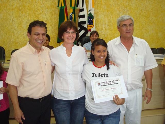 Dr. Marco Antonio Colman, Coordenador de Saúde Bucal, Dra. Isabel Cristina Dancieri da Silveira, Vereador Francisco Rossi e Joice Celestino de Freitas, aluna da 8ª Série da E.E. Profa. Julieta Guedes de Mendonça