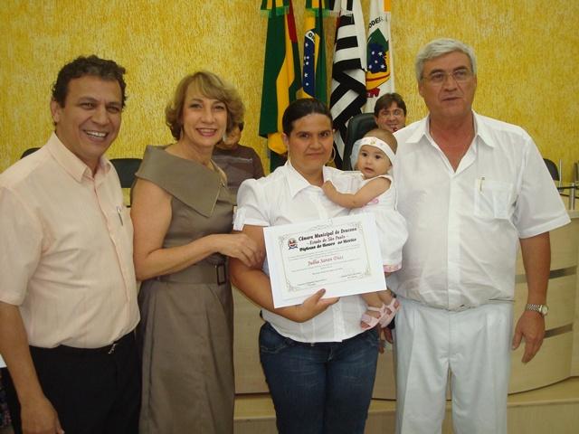 Dr. Marco Antonio Colman, Coordenador de Saúde Bucal, Dra. Maria Célia Branco Borges, Vereador Francisco Rossi e Jullia Saran Dias no colo da mãe, aluna do Programa Amigos do Peito