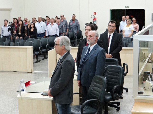 Vereadores e público presente na execução do Hino dos Bombeiros