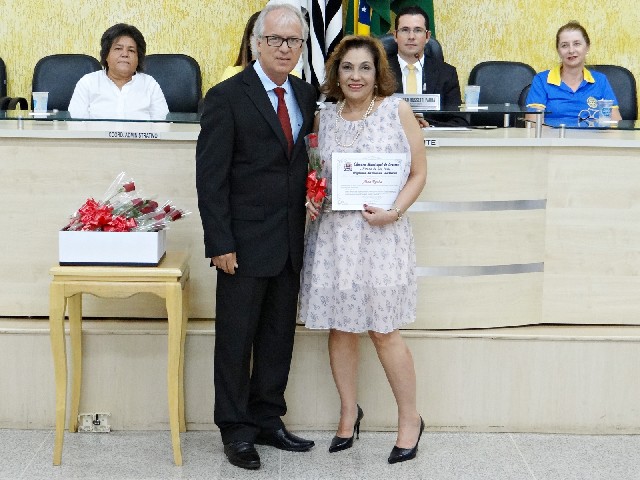 Vereador Ailton Lorensetti e a homenageada Alba Rocha (AVAHU)