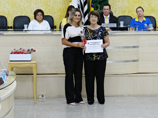 Vereadora Sara Scarabelli e a homenageada Maria Ap. Jacomini dos Santos (L. Maç. "Patriarca da Indepêndencia)