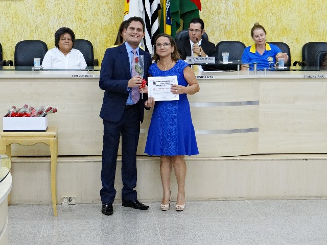 Vereador Victor Palhares e a homenageada Maria Aparecida Pessoa Cardoso (APAE)