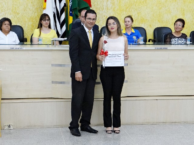 Vereador-presidente Rodrigo Parra e homenageada Kauisa Stefane de Freitas Mattos (Instituição Novo Amanhecer)