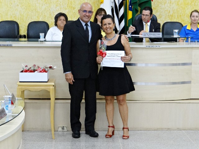 Vereador Célio Ferregutti e homenageada Neide Borges da Rocha Baptista (Lions Clube de Dracena)