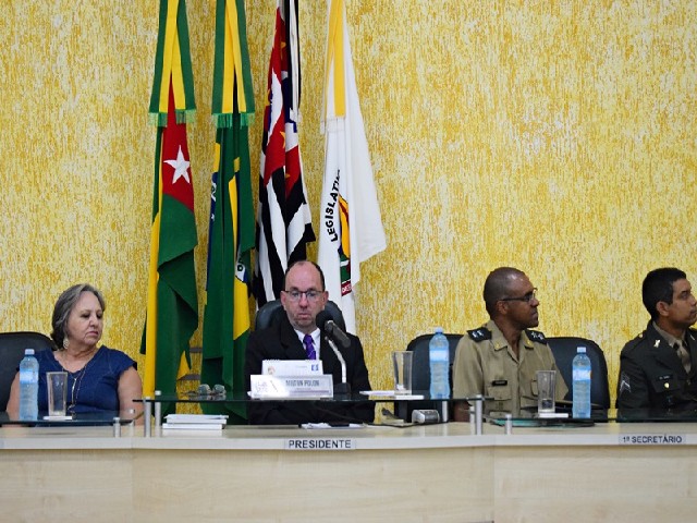 Vereador Cláudio José Pasqualeto assume por instantes a presidência para que o presidente Polon discurse