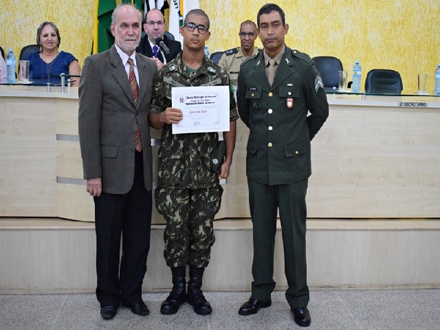 Atirador Igor Roza recebe das mãos do presidente Milton Polon e do Sgto Benício o Diploma de Honra ao Mérito