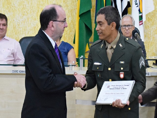 Vereador Cláudio José Pasqualeto cumprimenta o Sargento Benício pelos relevantes serviços prestados