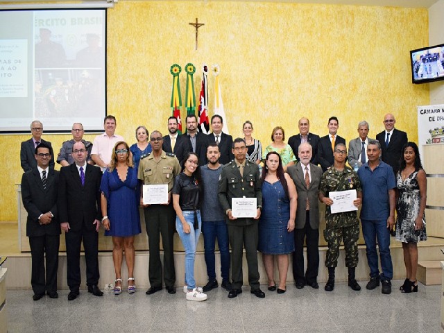 Autoridades, vereadores, homenageados e família durante a entrega de Diplomas de Honra ao Mérito