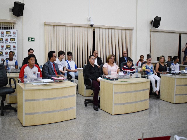 Vereadores e vereadores-estudantes durante a sessão de instalação do Parlamento Jovem 2019