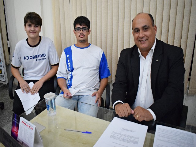 Vereador Juninho do Esporte e os vereadores-estudantes: Breno Ruela Sartori e Carlos Eduardo Rodarte Terra
