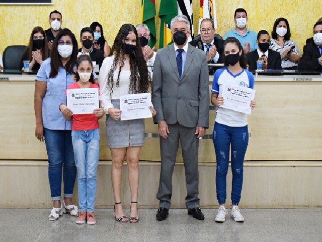 Vereador Julio Monteiro, a diretora Lucineide R. V. Trevizan e as alunas Ana Júlia, Ana Lívia e Maria Vitória