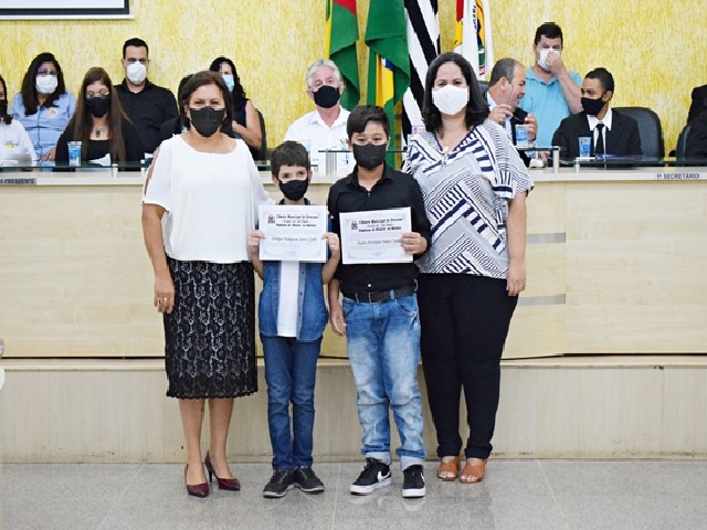 Vereadora Maria Mateus, a coordenadora Ana Flávia Bordoni e os alunos Felipe Yukiasu e Pedro Henrique
