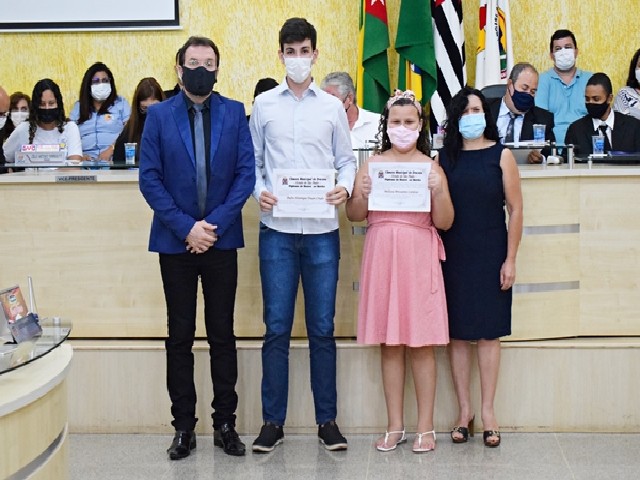 O vereador Sidnei Contelli, diretora Eliane Santana e os alunos Melissa e Pedro Henrique