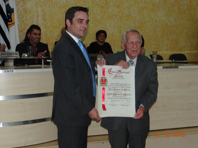 Vereador Gustavo Rodrigues Piveta e o homenageado Senhor Celso Cardoso de Souza