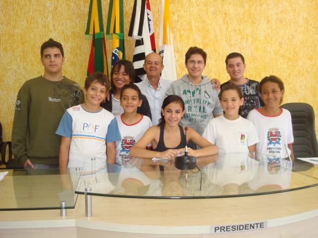 Vereador Presidente Nelson Nabor Buzinaro com os Vereadores Mirim do Parlamento Jovem