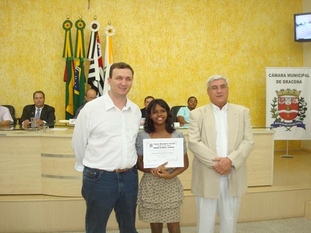 Vereador Francisco Eduardo Aniceto Rossi, Dr. Renato Alexandre Zanoli, a Amanda Miranda dos Santos - aluna do 5º Ano, da EMEFI João Millan Barbosa