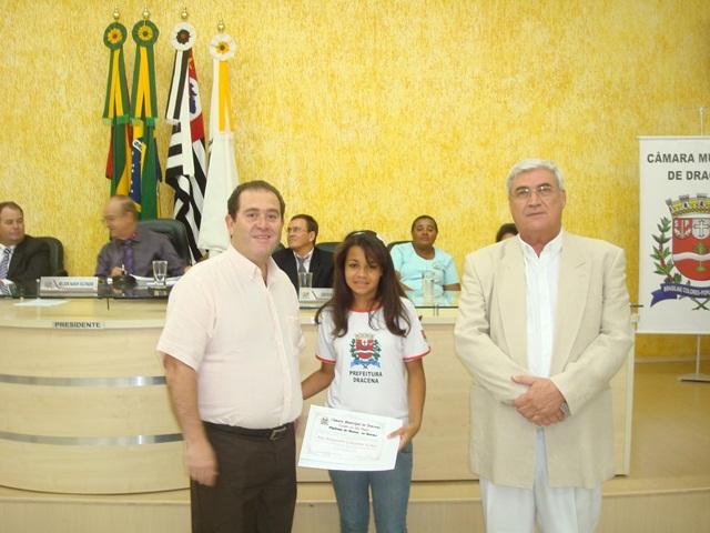 Vereador Francisco Eduardo Aniceto Rossi, Dr. José Roberto Vieira, a Ana Alexsandra Gonçalves Uchoa - aluna do 5º Ano I, da EMEFI Guilherme Tammerick