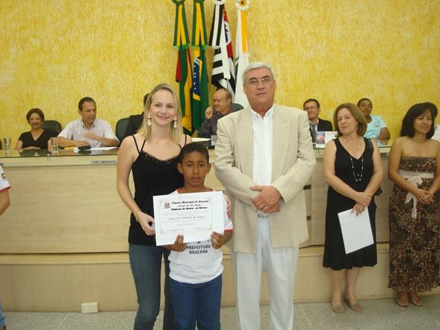 Vereador Francisco Eduardo Aniceto Rossi, Dra. Renata Ocon Braga Polo, a Lino Caio Ferreira de Souza - aluno do 4º Ano da EMEFI Sérgio Liberatti