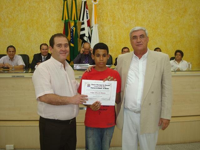 Vereador Francisco Eduardo Aniceto Rossi, Dr. José Roberto Vieira, a Felipe Silva de Oliveira - aluno da 7º Série da E.E. Alfredo Machado