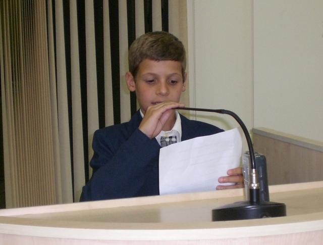 Vereador-estudante Vinícius Confortini, da Escola Guilherme Tammerik, usando a Tribuna da Câmara