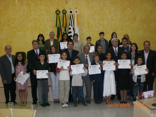 Participantes do Parlamento Jovem, com vereadores, após a diplomação