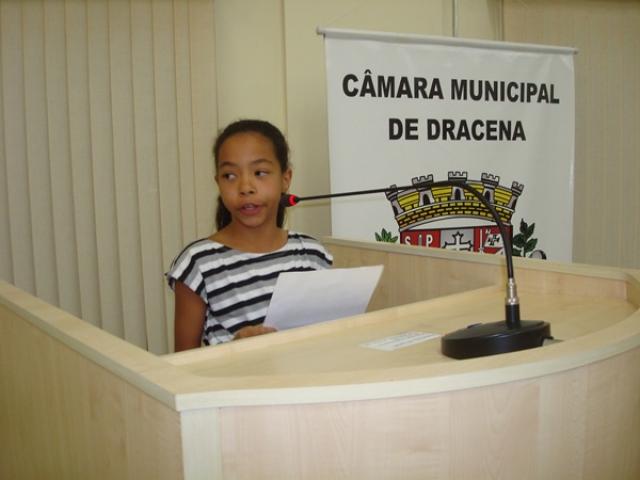 Vereadora-estudante Carolaine Cristina Lima Lopes, da Escola Guilherme Tammerik, usando a Tribuna da Câmara