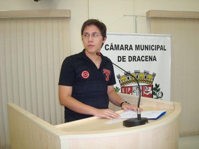 Vereador-estudante Kaue Marques de Camargo, do Colégio Objetivo, usando a Tribuna da Câmara
