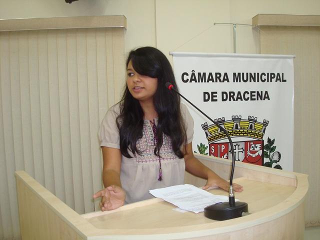 Vereadora-estudante Pâmela Alvina Rodrigues Fonseca, da Escola Sérgio Liberatti, usando a Tribuna da Câmara