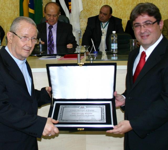 Vereador Juliano Brito Bertolini e o homenageado Dom Osvaldo Giuntini - Bispo Diocesano de Marília - Foto Cláudio José