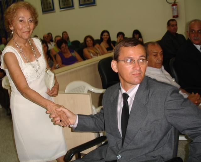 Vereador Ademir Ussifatti recebendo a Sra. Esmeralda Maria Lins esposa do ex-Vereador João Holmes Lins