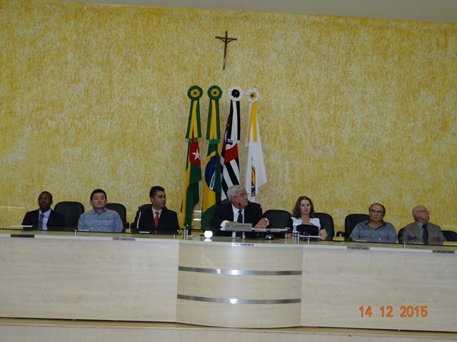 Mesa - Presidente Francisco Eduardo Aniceto Rossi, Secretário Ricardo Silva, Vice-Prefeita Célia Brandani, Professores Edson Kai e Ronaldi Torelli e homenageados Professores José Geraldo de Souza e José Hamilton Caldas