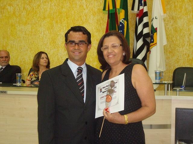 Vereador Kielse Chiari Munis e a homenageada Sra. Gislaine Andrade Leopaci Benini