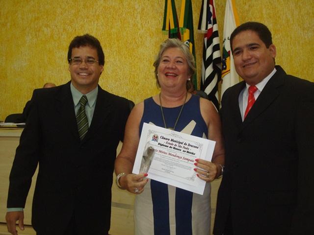 Vereador Divanir Ledo dos Santos, a homenageada Sra. Maria Mirtes Mendonça Sampaio - Loja Maçônica União, Justiça e Amor e o Vereador Rodrigo Castilho Soares.