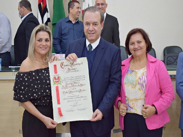 Vereadores Sara Scarabelli e Maria Mateus com o homenageado Eleuses Paiva