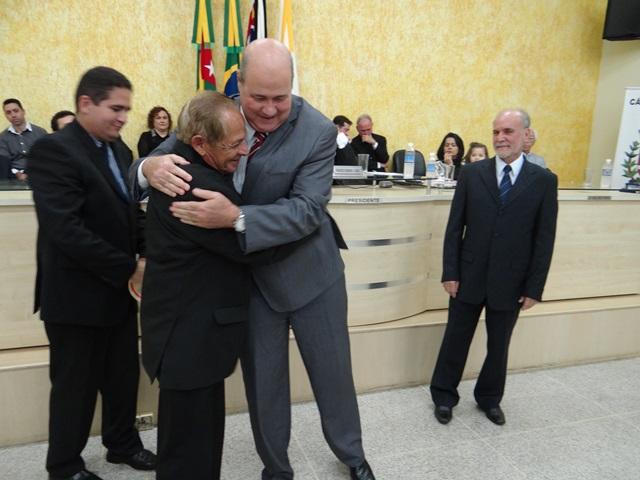 Prof. Paulo Figueiredo cumprimentado pelos vereadores Luiz Coelho, Milton Polon e Rodrigo Castilho, autores do Decreto Legislativo n° 20/2015 que concede o Título de Cidadão Honorário.